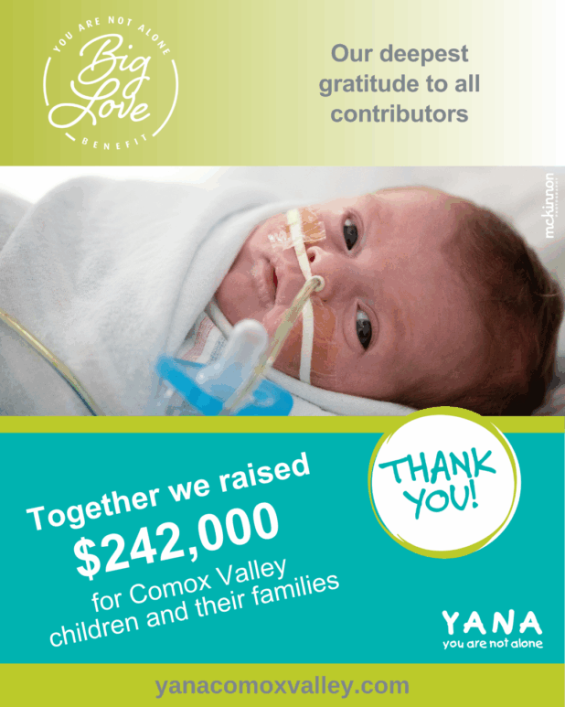 Comox Valley, you never cease to amaze us. Thanks to your incredible generosity, the Big Love 2025 Benefit raised an astounding $242,000 for YANA families! From heartfelt auction bids to warm reunions around the dinner tables, every moment was a testament to the love and support that define this community.