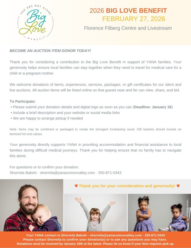 This event is a testament to the unique spirit of the Comox Valley—a community that comes together to ensure no family feels alone in their time of need. The success of the Big Love Benefit depends on the incredible generosity of sponsors, donors, and supporters like you.